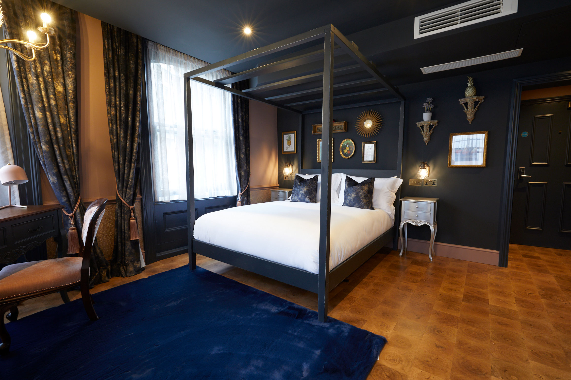 A spacious first floor boutique room, where everything surrounds a stunning 4 poster bed fit for royalty. Fitted with a desk with views over Great Titchfield Street for those working weekends in luxury. This room benefits from free WIFI, A/C and mini-fridge along with en-suite bathroom.